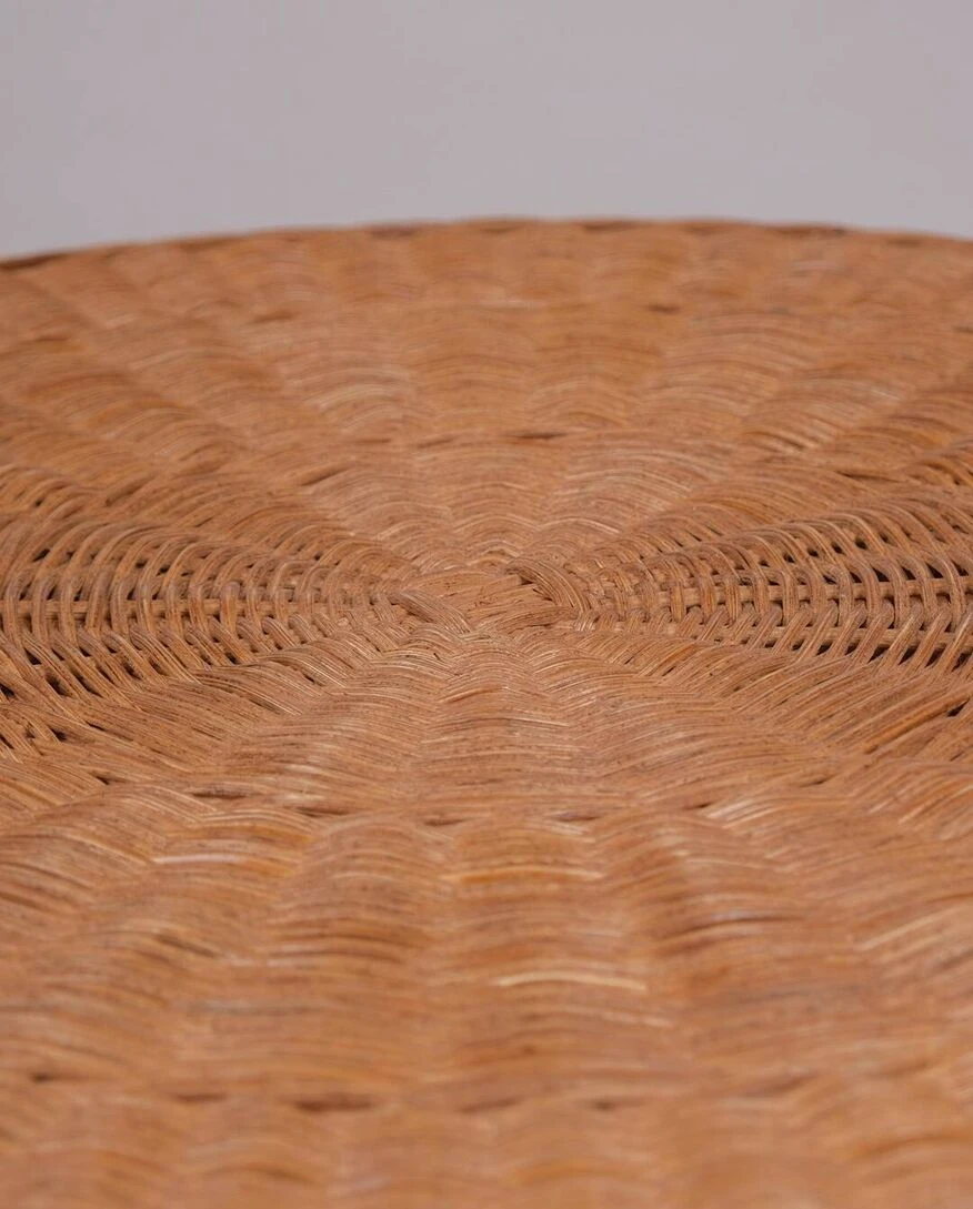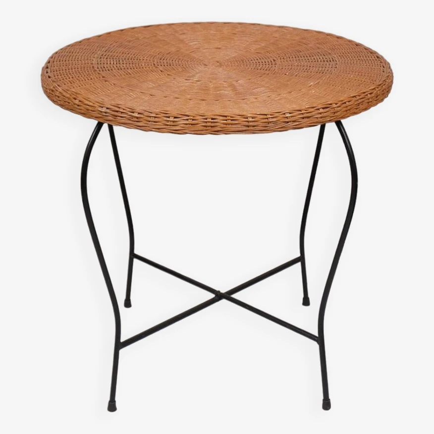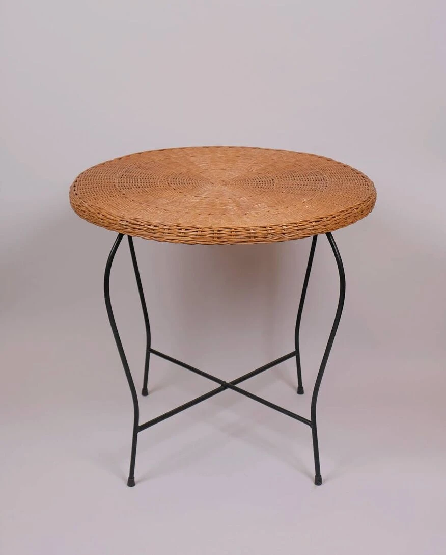 Vintage round table, woven wicker top and curved metal legs.